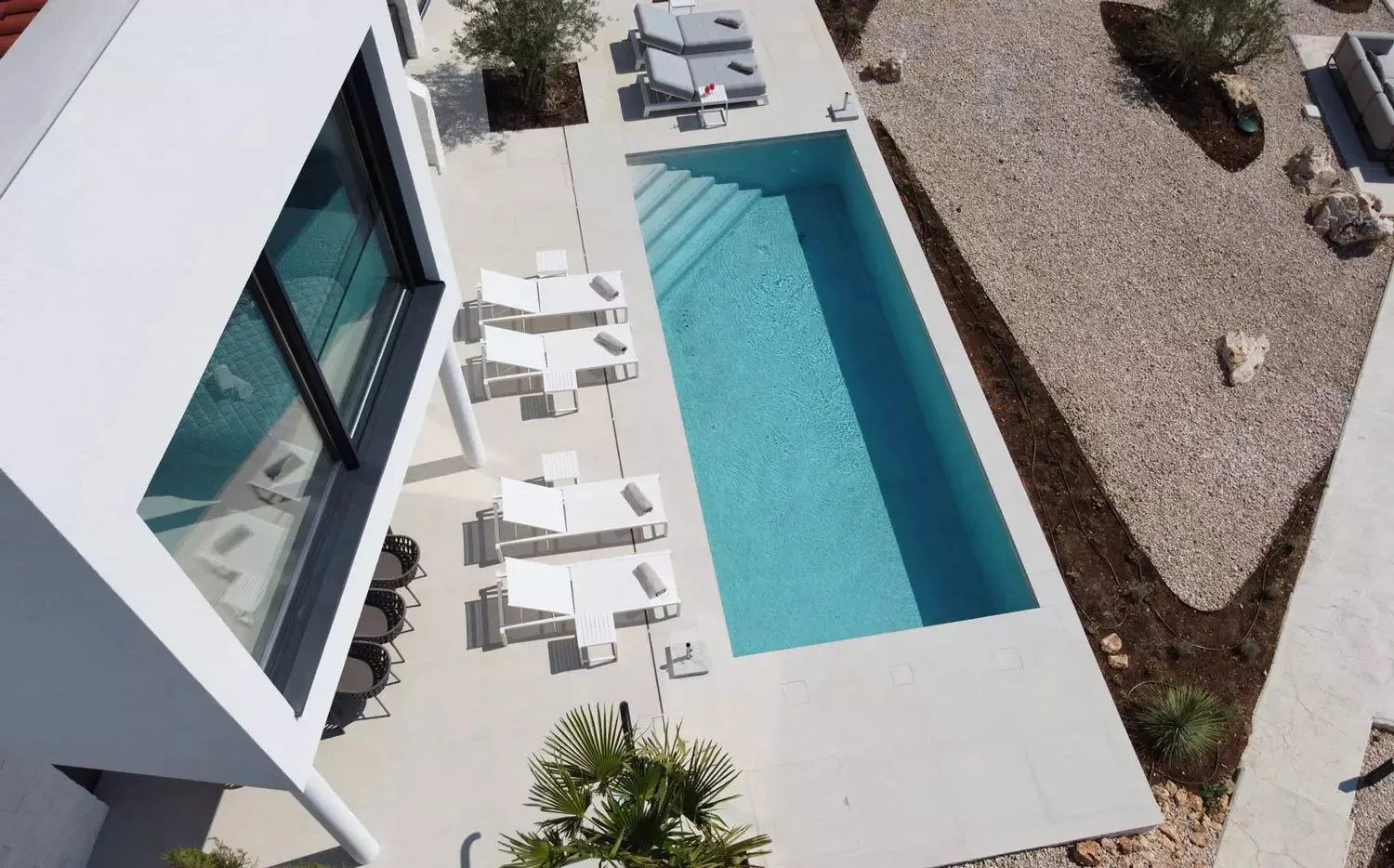 Villa Marim hat 4 Schlafzimmer und 5 Badezimmer — Platz für bis zu 8 Gäste. Jedes Schlafzimmer verfügt über ein eigenes Bad und Meerblick. Die Master-Suite im Obergeschoss hat raumhohe Fenster zur offenen Adria — Sie wachen mit dem Blick und dem Klang des Meeres auf.